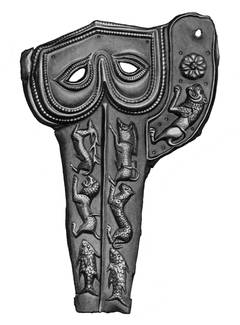 Unser nächstes Stück ist ein 137,2 Gramm schwerer, 19cm langer und 13cm breiter Beschlag einer Schwertscheide. Im Gegensatz zu den beiden vorherigen Stücken ist er nicht durch Hitze beschädigt worden. Wie Fisch und Vierpaßphalera handelt es sich um getriebenes Goldblech mit figürlicher Verzierung. Der obere und breitere Bereich weist 13 Löcher auf, die einst zur Befestigung dienten. Der Rand des schmaleren unteren Bereiches ist umgebogen worden. Er wird durch eine Rippe geteilt. In jeder Hälfte sind drei Tiere, die sich auf den oberen Bereich des Stückes zu bewegen. In der oberen Hälfte läuft ein Eber vor einem Panther weg. Hinter dem letzteren ist ein Fisch dargestellt. In der anderen Hälfte flieht ein Hirsch vor einem Löwen. Auch hier wird die Szene mit einem Fisch abgeschlossen.